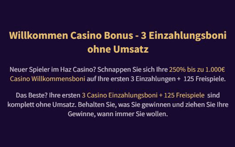 Sinn macht der Haz Casino Bonus vor allem für Neulinge und zurückhaltende Spieler. Du musst keine Bonusbedingungen beachten und kannst dir neben Bonusgeldern auch noch Freispiele schnappen. Da der maximale Gewinn aus dem Angebot beschränkt ist, wirst du als Highroller mit diesem Bonus jedoch wohl weniger glücklich werden. Jeder Anfänger greift hier aber zu einem guten Angebot.