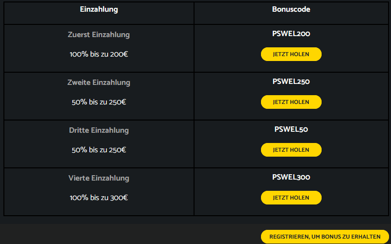 - Willkommensbonus: Bonuspaket von bis zu 1000€